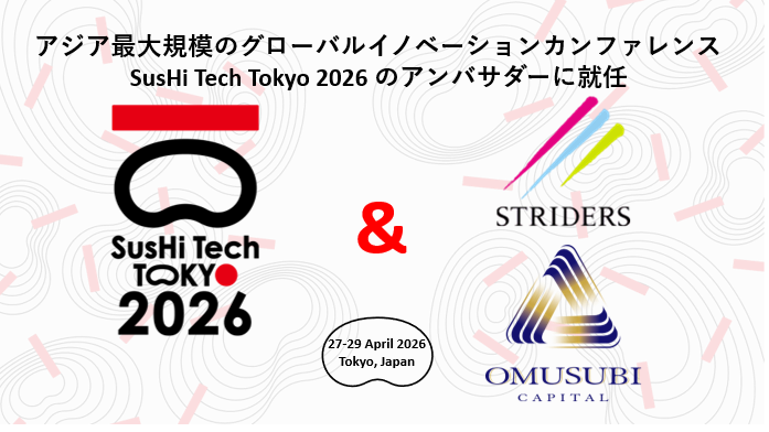 株式会社ストライダーズ(本社:東京都中央区日本橋室町4-6-2 菱華ビルディング 9階、代表取締役:早川 良太郎、以下「当社」)及び当社運営するファンド運営会社である「Omusubi Capital VCC(本社:シンガポール、取締役:ハツルシンハ ネーラカ)は、2026年4月27日(月)~29日(水)に日本・東京にて開催される、グローバルイノベーションカンファレンス「SusHi Tech Tokyo 2026 (スシテックトウキョウ2026)」のアンバサダー就任が決まりましたのでお知らせいたします。